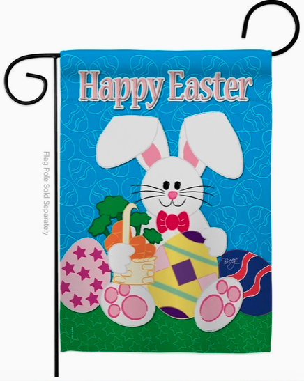Celebrate Easter with this cute flag appliqued on burlap. Printed on thick, weather resistant fabric and double-sided. Display this 13x18.5" flag on one of our garden posts. Double-sided.