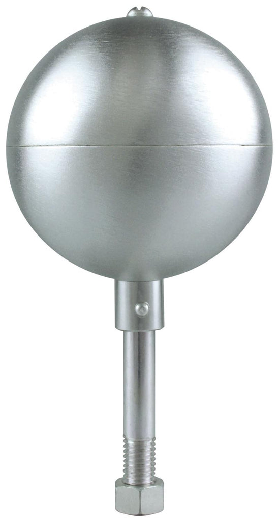 Silver anodized ball. Choose diameter of ball to match diameter of flagpole at ground level. Spindle .5 inch.