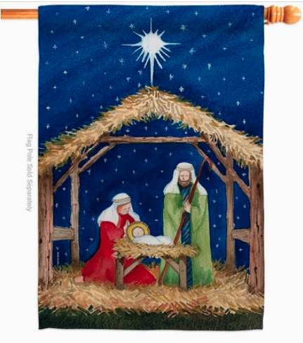 Decorate for Christmas with this attractive Nativity design. Printed on weather resistant, thick polyester fabric. Fly the 28x40" size on a 5 ft spinning pole. Double-sided and readable from both sides.